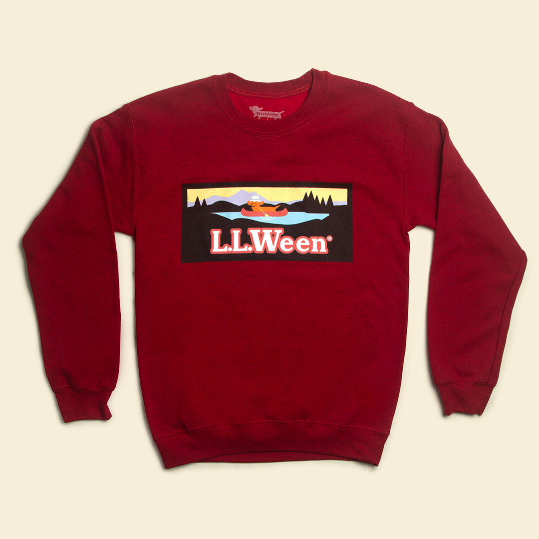 Grab your L.L. Ween Crew and a cup of coffee for you next day on the trail or cuddle sesh on the couch! Featuring a woodsy weenie canoeing across a serene lake wearing a bucket hat. This cozy crew design puts a spin on the timeless logo and will be a favorite for years to come.